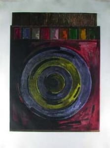 この問いをさらに推し進めたのが、「標的」シリーズです。《4つの顔のある標的》(1955年)では、円形の標的が描かれたキャンバスの上部に、人間の顔の一部をかたどった石膏のオブジェが置かれています。これにより、絵画と彫刻がひとつの作品の中で直接ひとつになり、アートが単なる「イメージ」ではなく、具体的な「モノ」であることを強調しています。