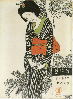 夢二の最高傑作。憂いを帯びた表情の女性と黒猫が描かれ、夢二式美人のすべてが凝縮されています。