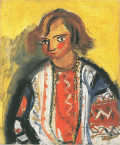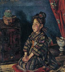 モンパルナスで出会ったロシア人の少女をモデルに描いたとされる肖像画。憂いを帯びた少女の表情と背後の壁の質感表現が印象的です。佐伯の夭折を偲ぶ遺作の一つとなっています。