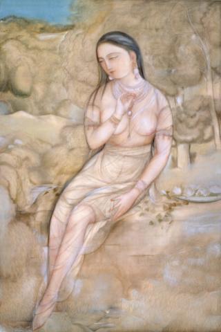 晩年の代表的裸婦像。中国風の寝台に横たわる裸婦を描いた大胆な作品で、小出の官能的表現の極致とされています。