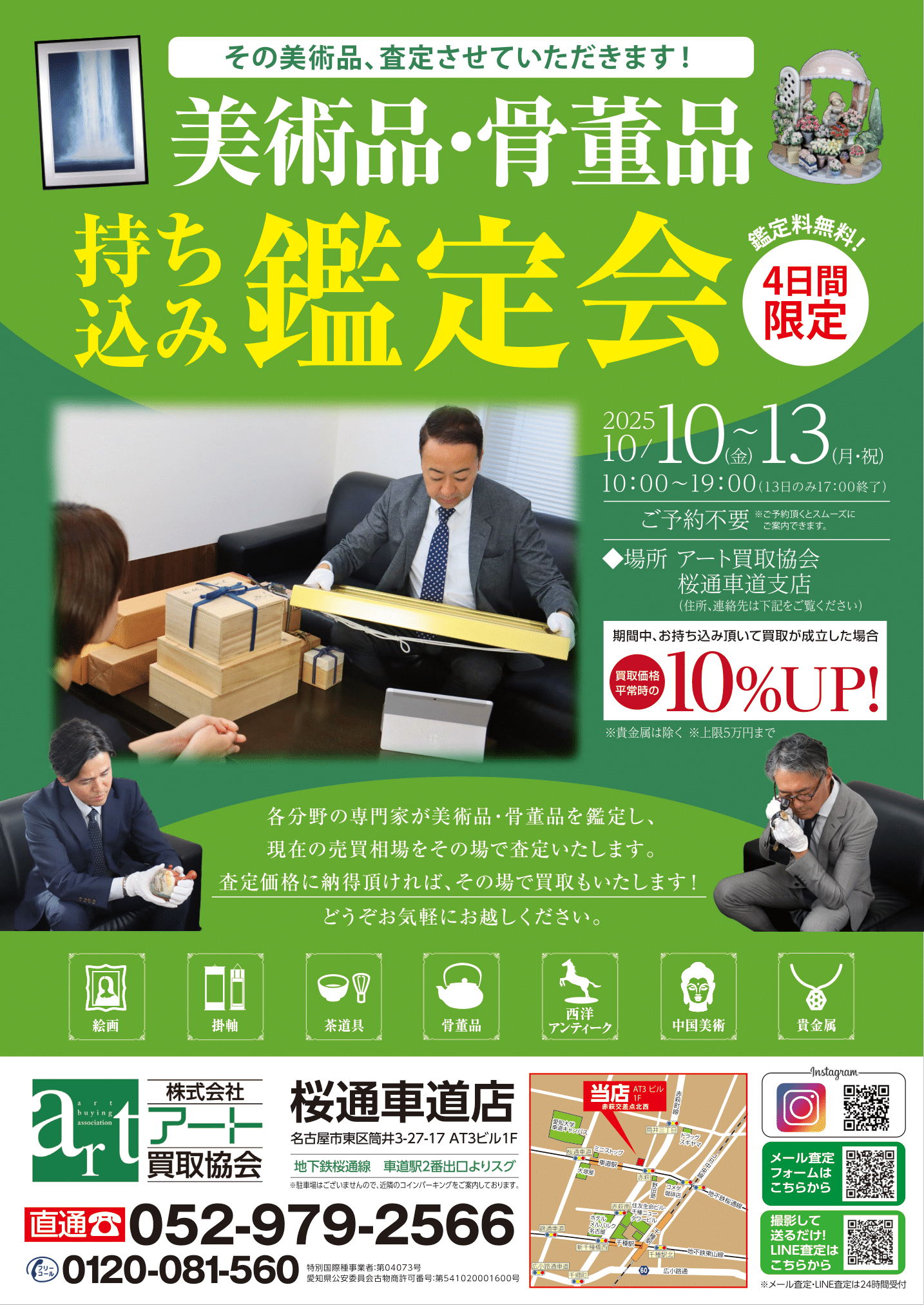 10/10(金)~10/13(月)まで、アート買取協会「桜通車道店」にて「絵画・美術品・骨董品鑑定会」を開催致します。